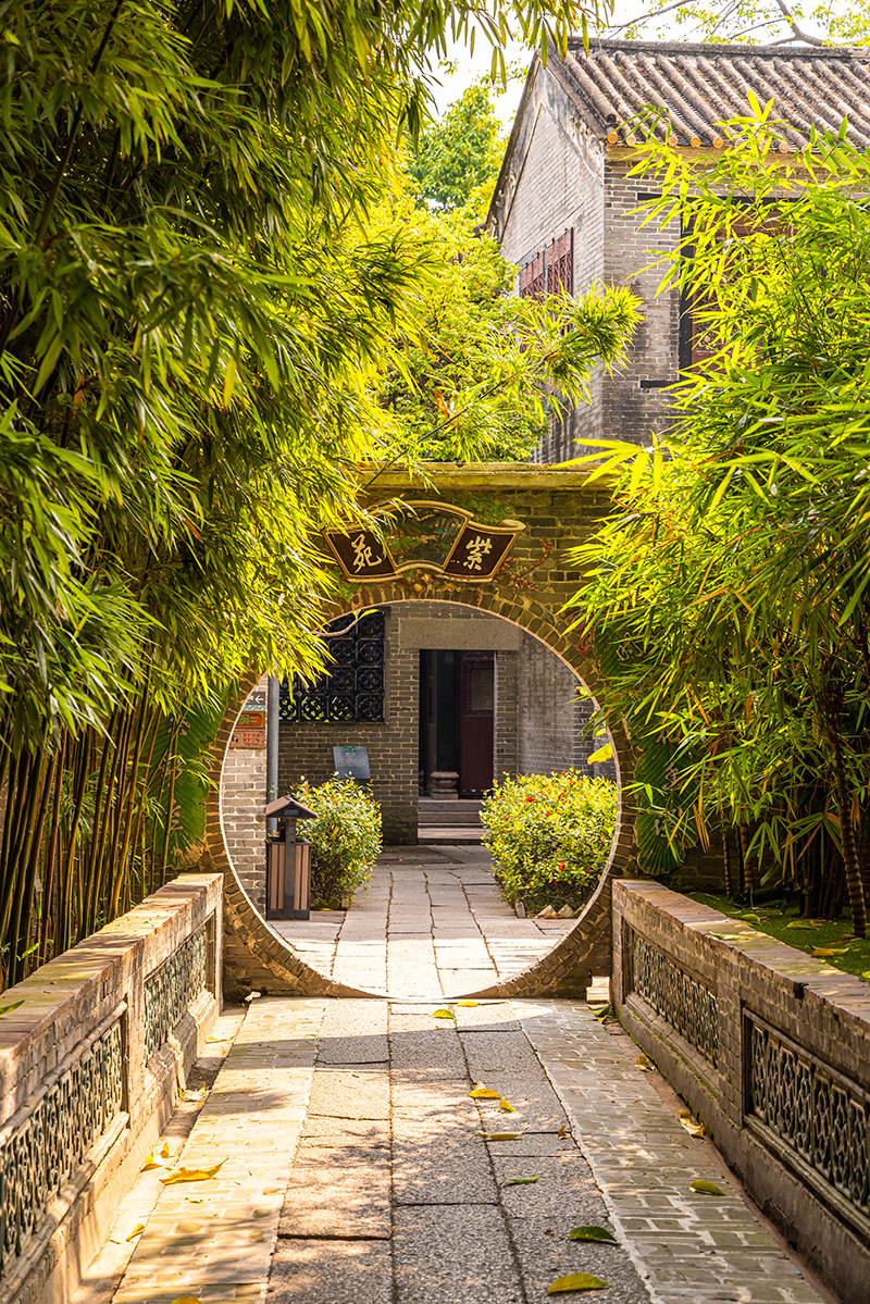竹苑正门对联写道,“风过有声留竹韵,明月无处不花香”。穿过月亮门回望,上方塑有“紫苑”二字,两旁装饰有绿色芭蕉叶灰塑,叶上又有一副对联“时泛花香溢,日高叶影重”。放眼望去,两排秀逸纤细的竹林,竹影婆娑,风吹幽香,一派蓬勃向上景象。在岭南地区,翠竹与芭蕉是常见植物,有丰富的文化寓意,如竹子代表子孙繁盛,所谓“十丈龙孙绕凤池”,更有竹报平安,高风亮节之寓,而芭蕉因枝叶壮大、长势蓬勃,有“家大业(叶)大”的寓意。