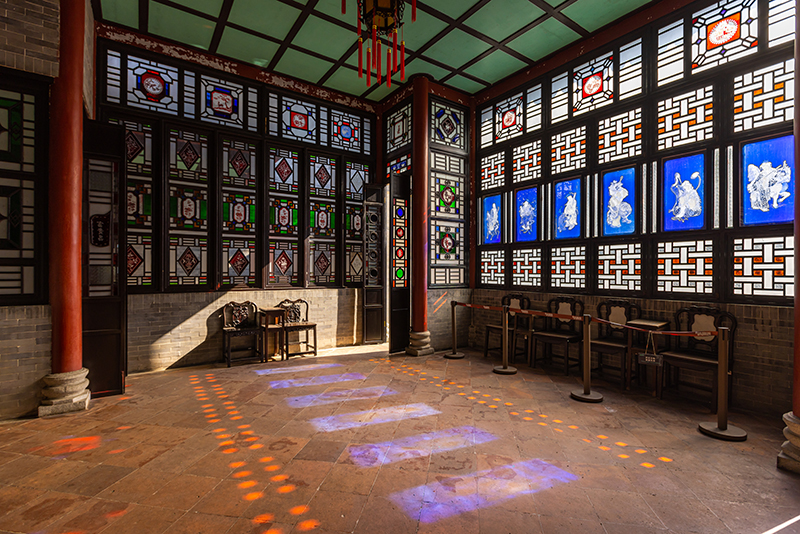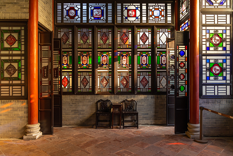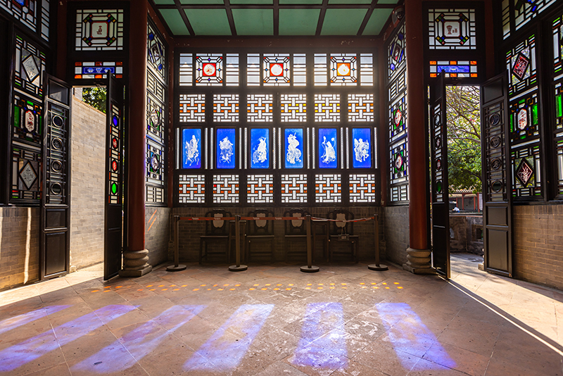留芬阁位于园区的东北角,主体高四层,是清晖园中最高的建筑。它是一座富有岭南风格的建筑,上层是青砖墙体,底层采用落地玻璃窗装饰,通风采光,绚丽多彩。窗格上镶有六块蓝片玻璃蚀刻画,是神话传说“八仙过海”中的六位道教仙人。明蓝可人的色地上,以蚀刻白线条勾勒手持法器的仙人们,神态生动自然。