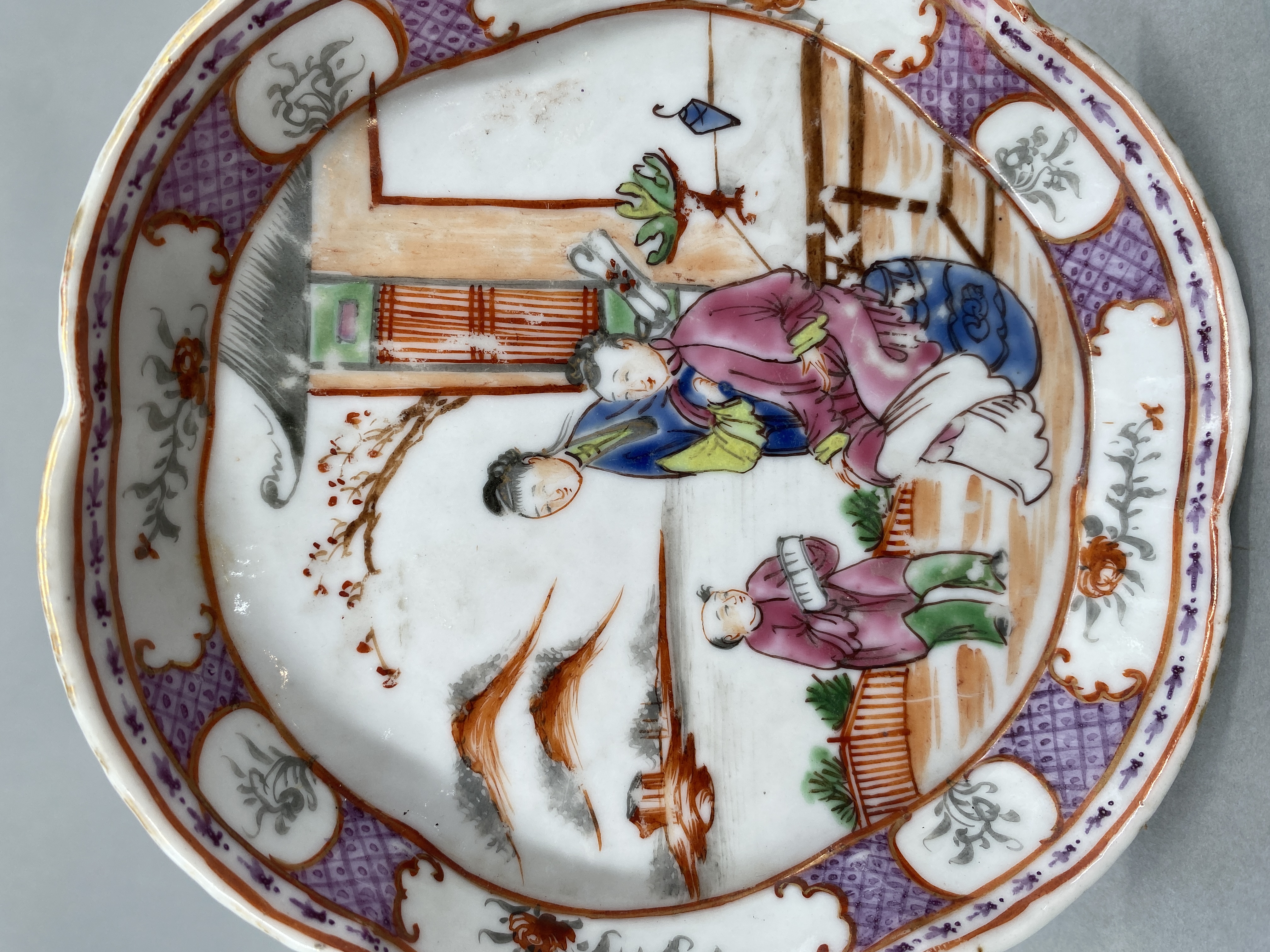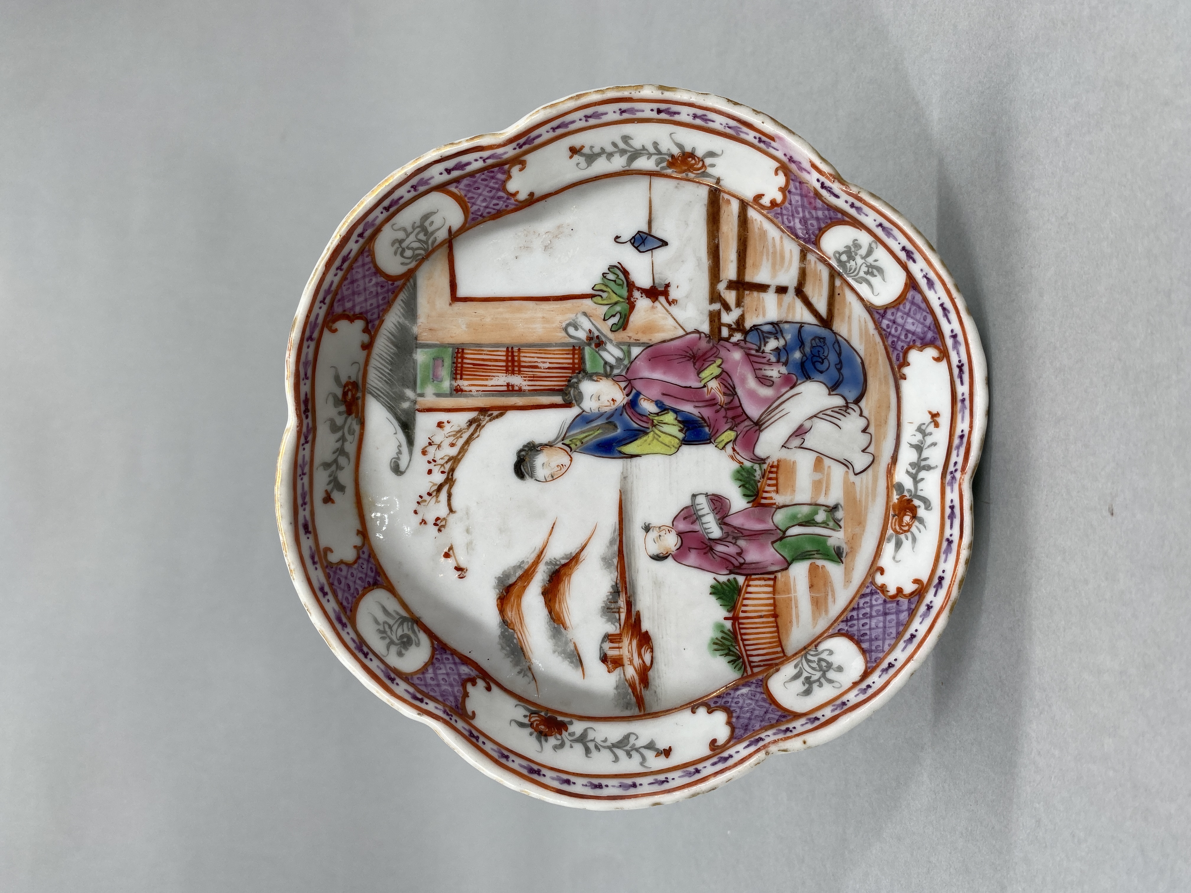 清广彩山水人物纹六瓣花口盘
