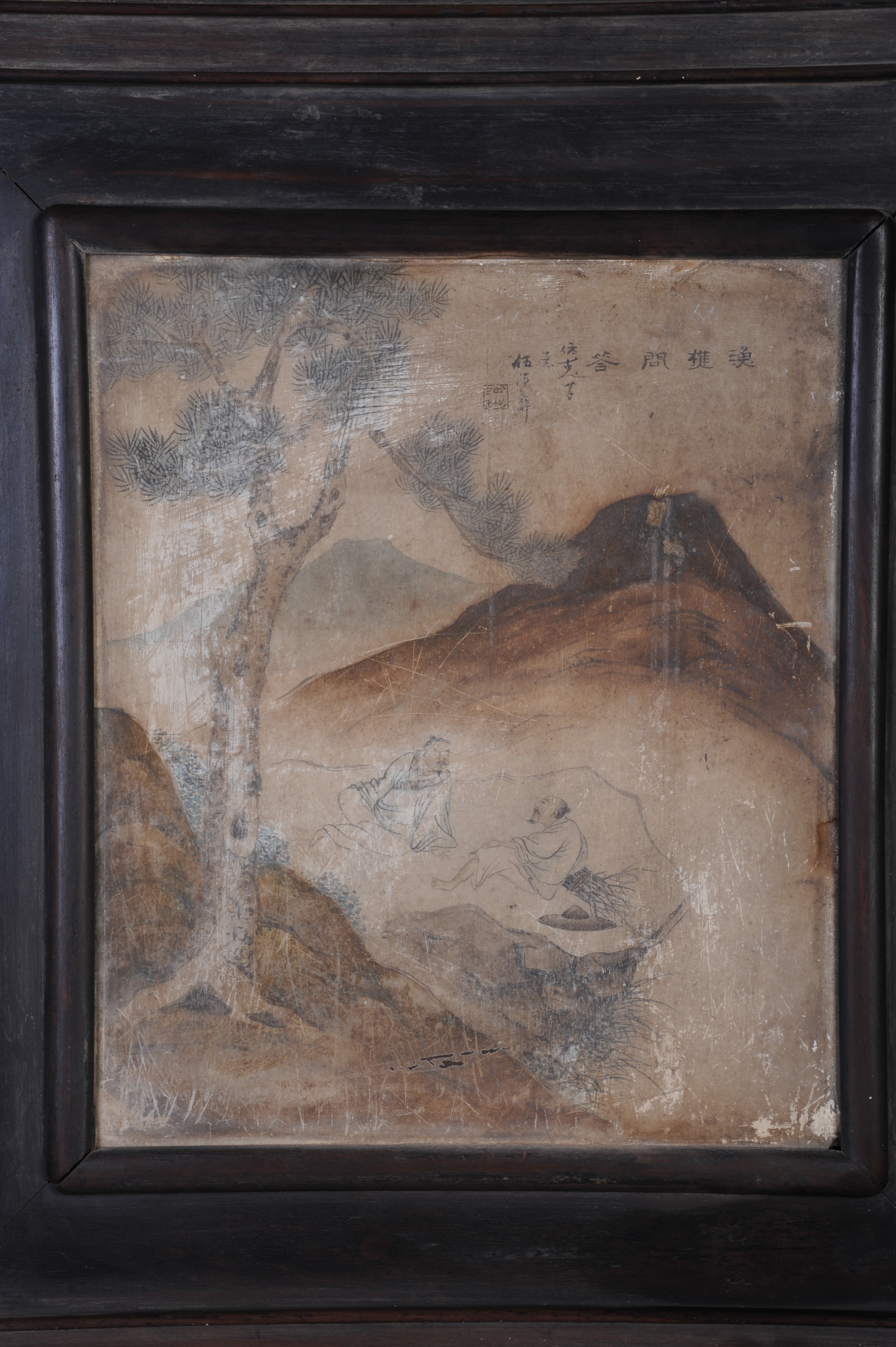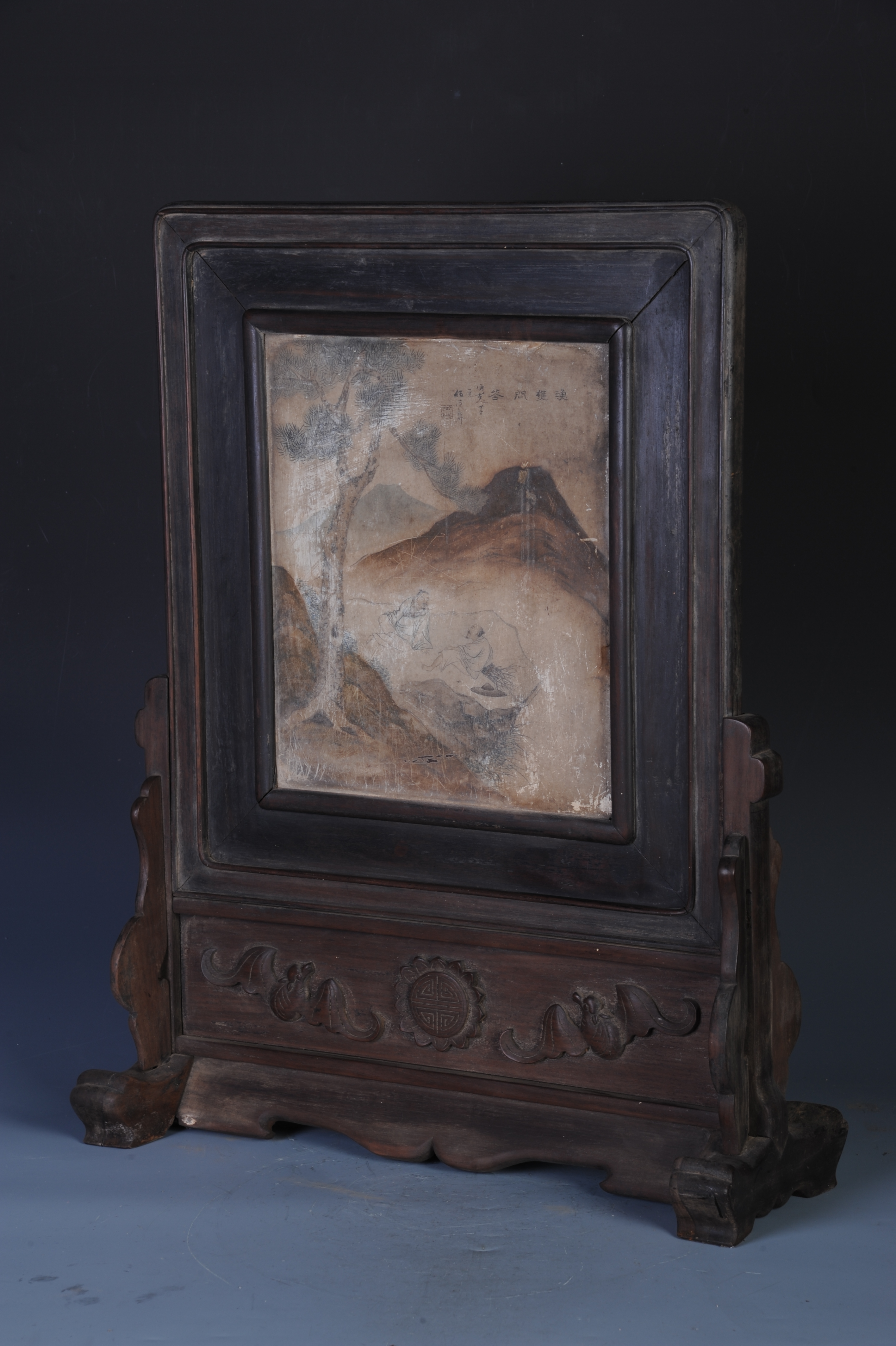 中华民国酸枝镶石绘伍德彝渔樵问答图座屏