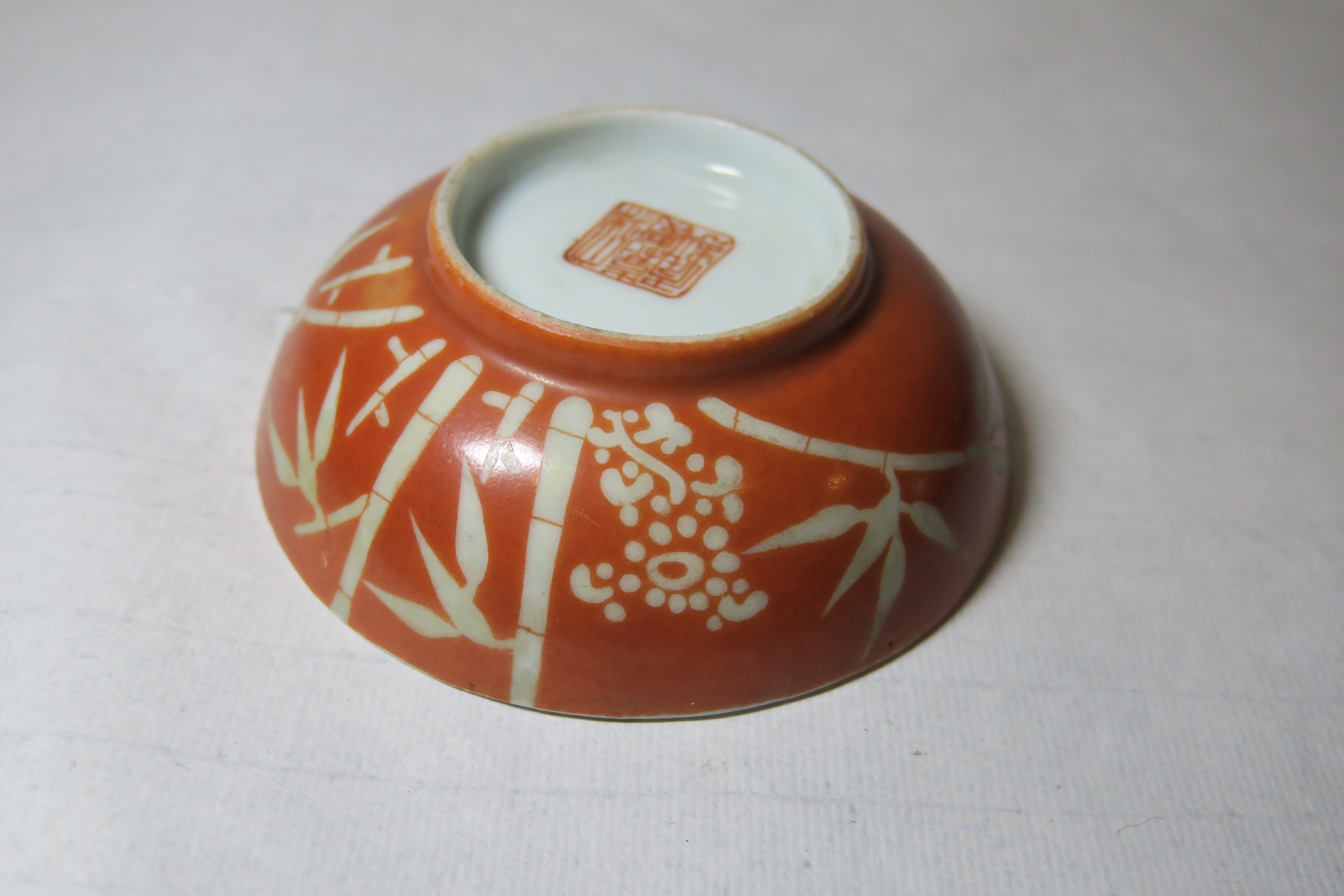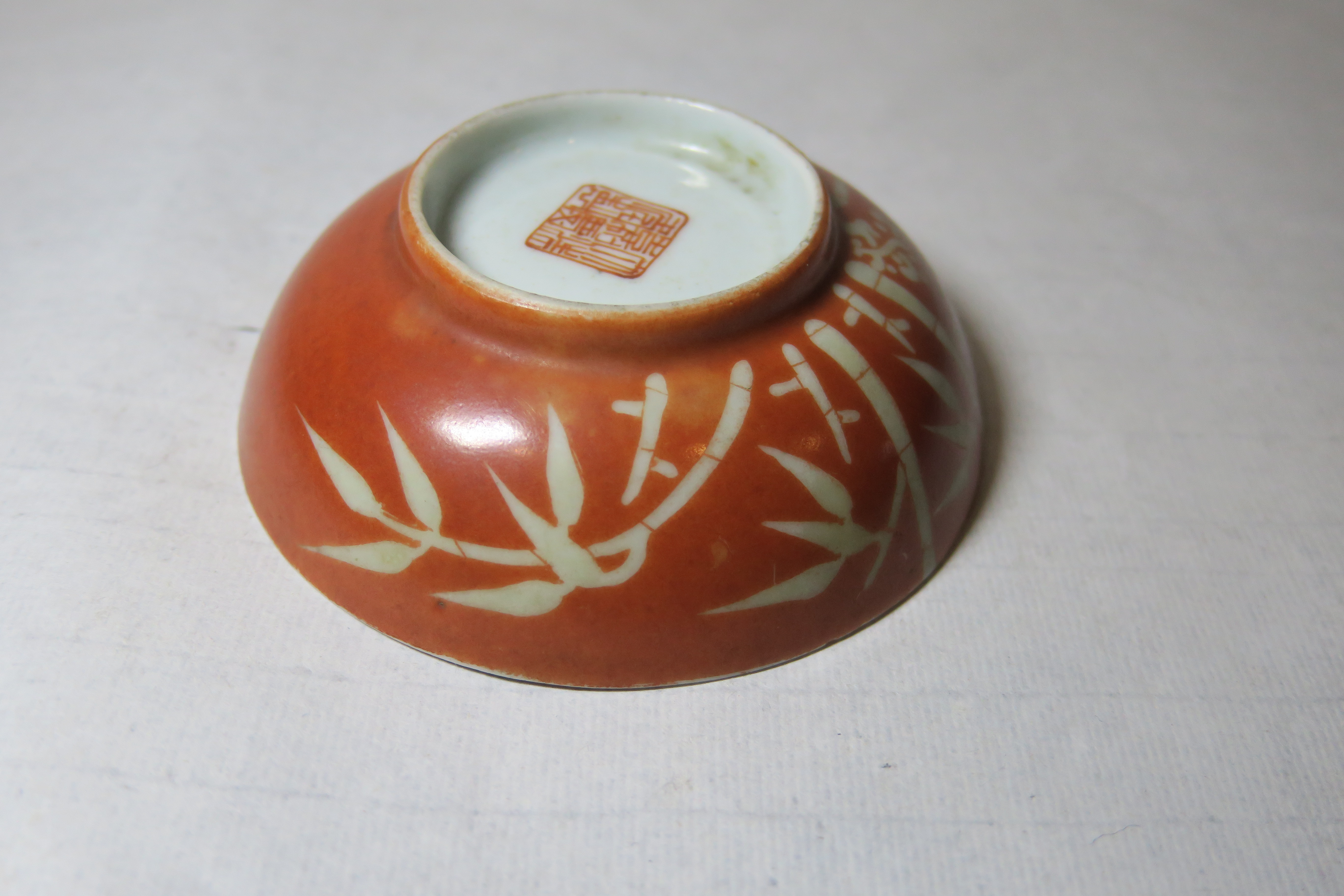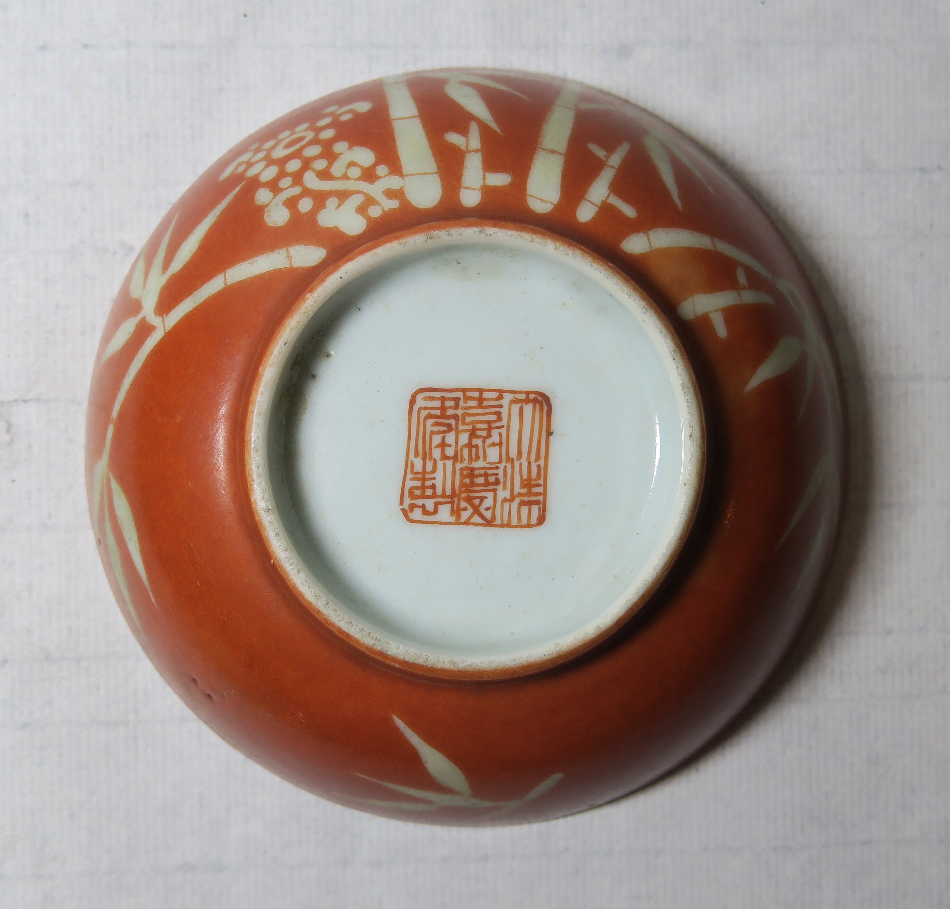 清嘉庆款矾红釉描金竹纹碗