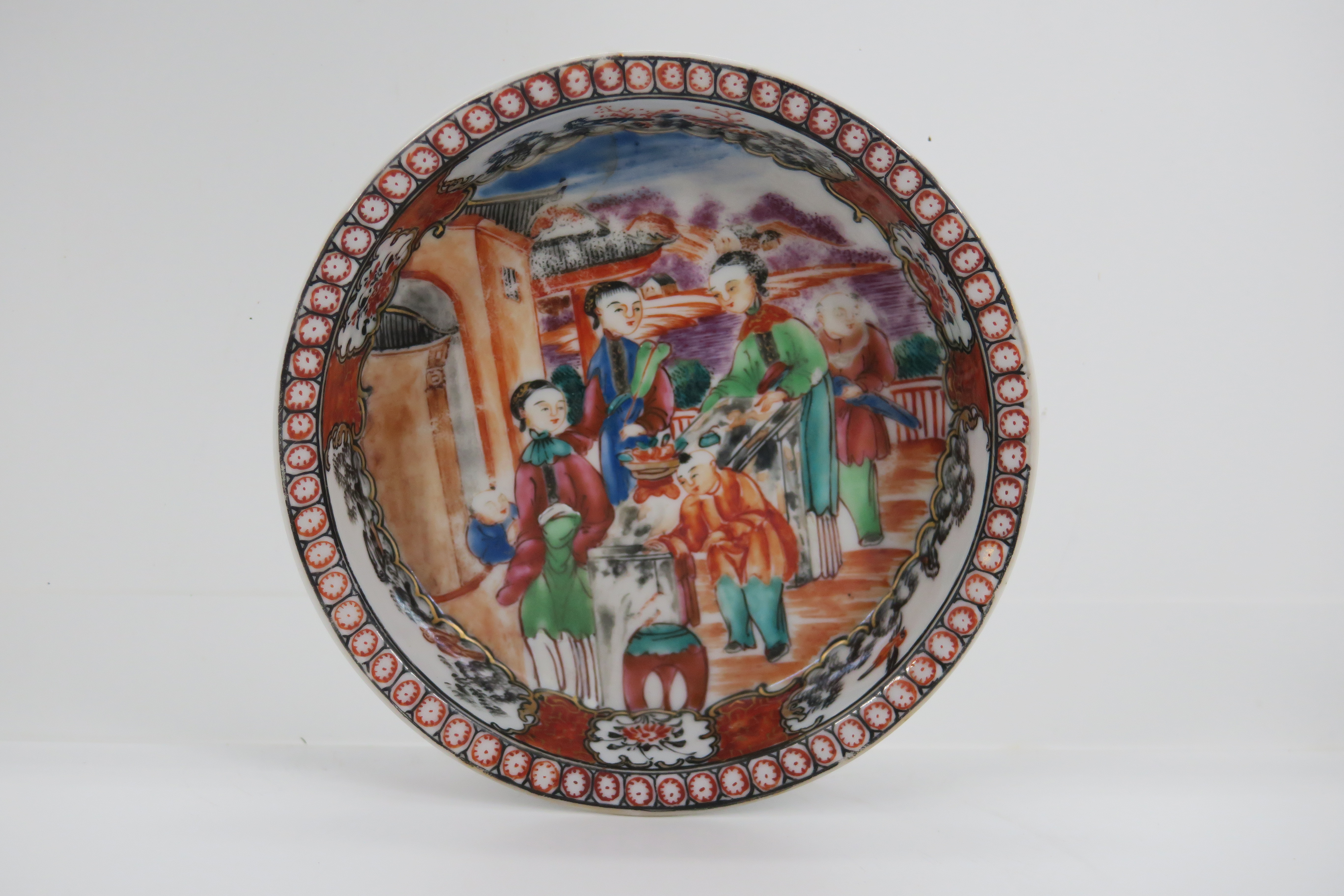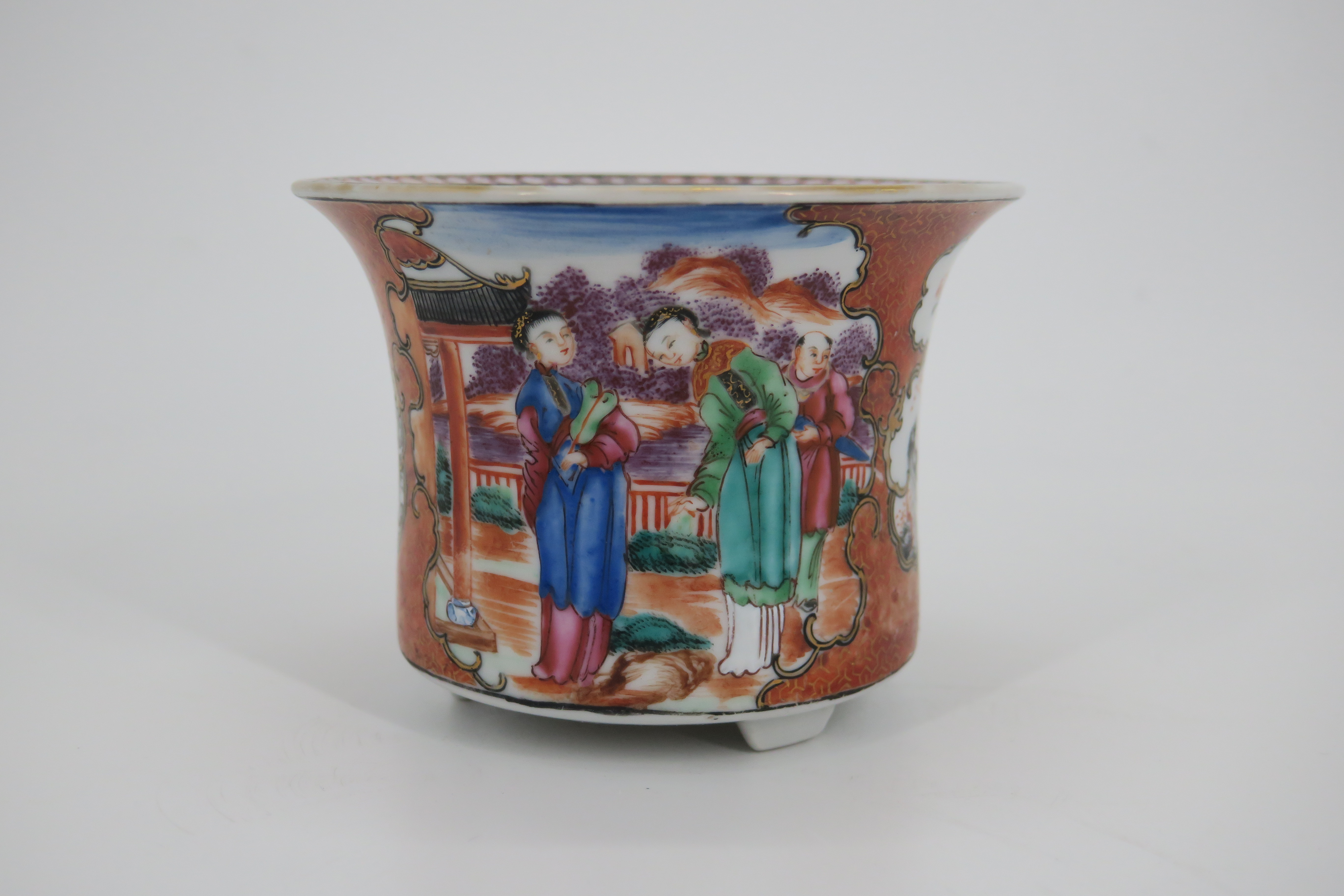 清广彩锦地开光人物纹三足花盆连托