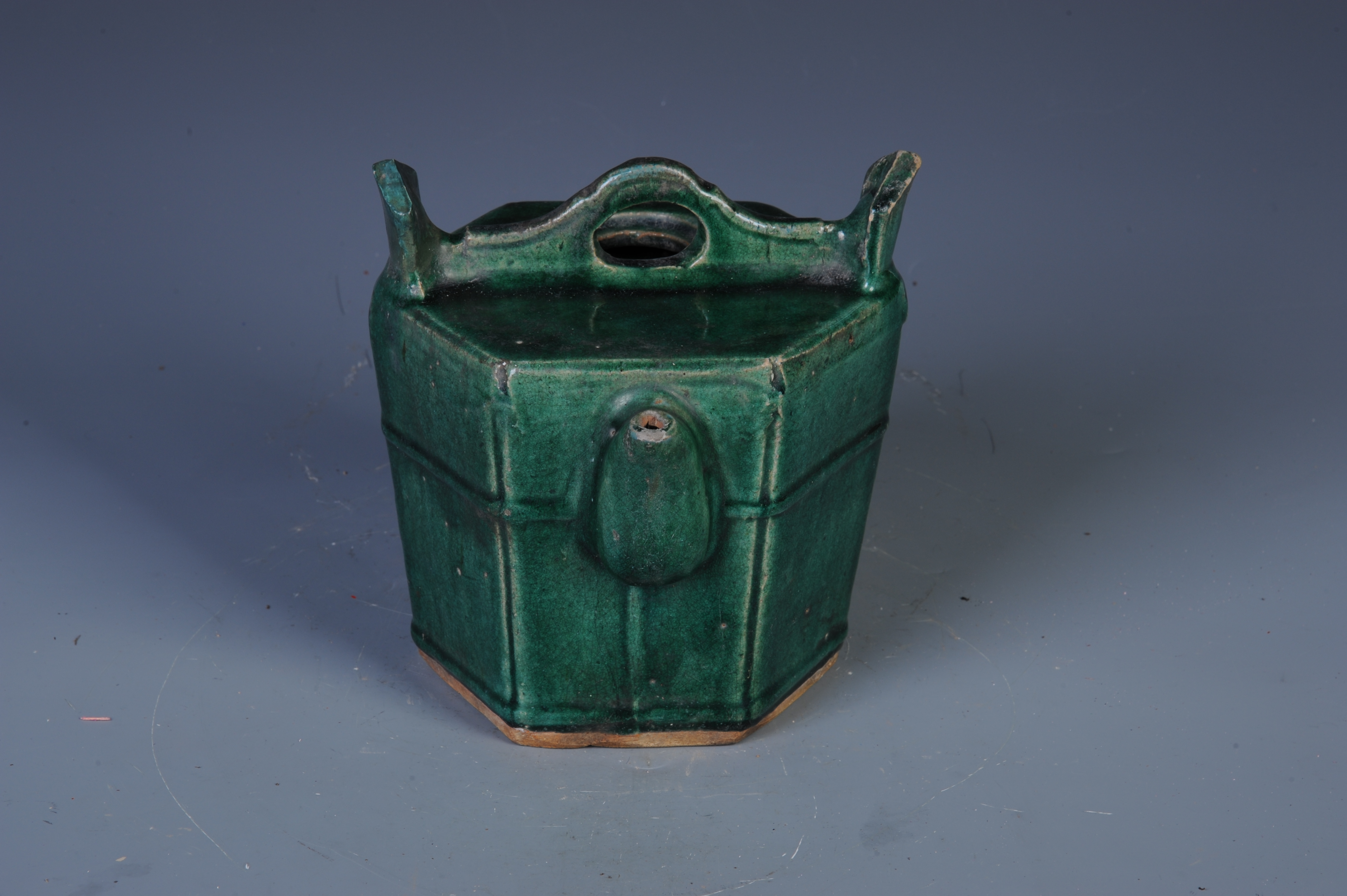 中华民国石湾窑绿釉六角提梁壶