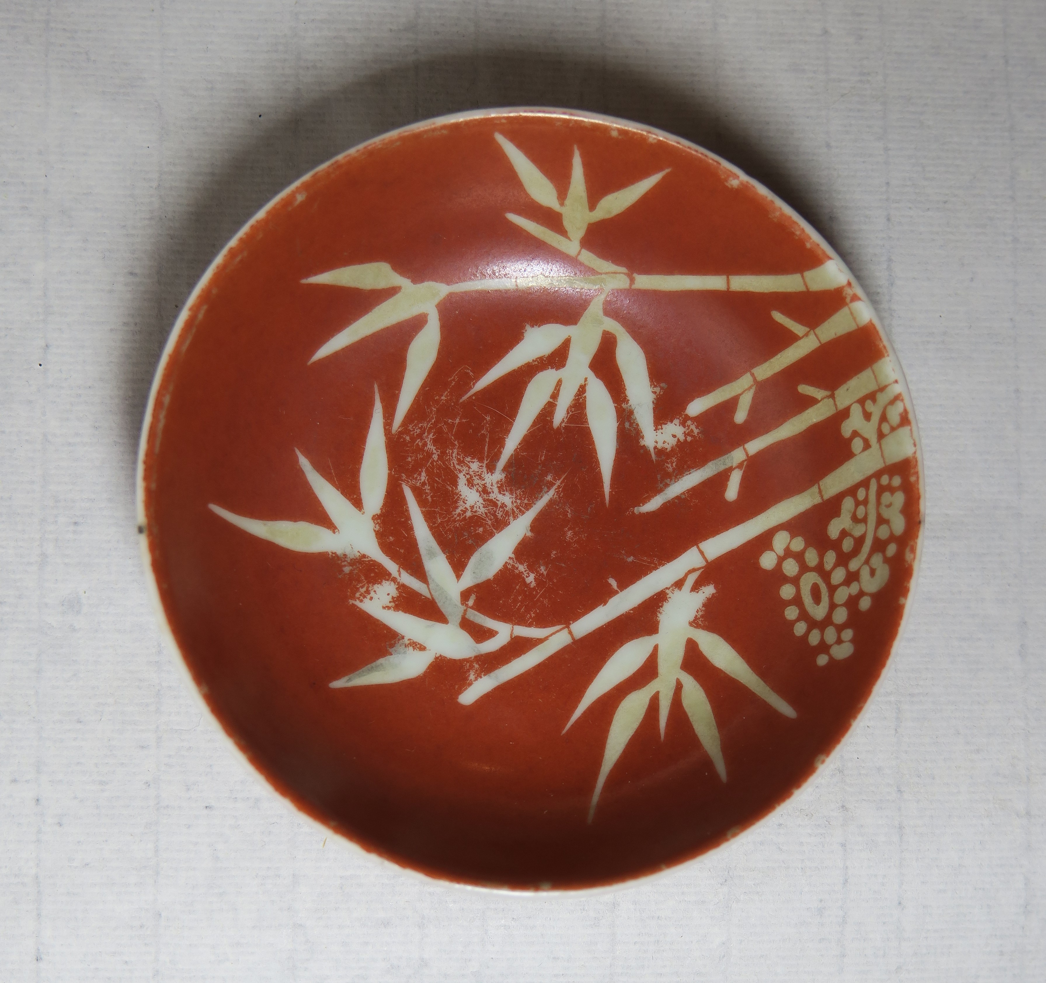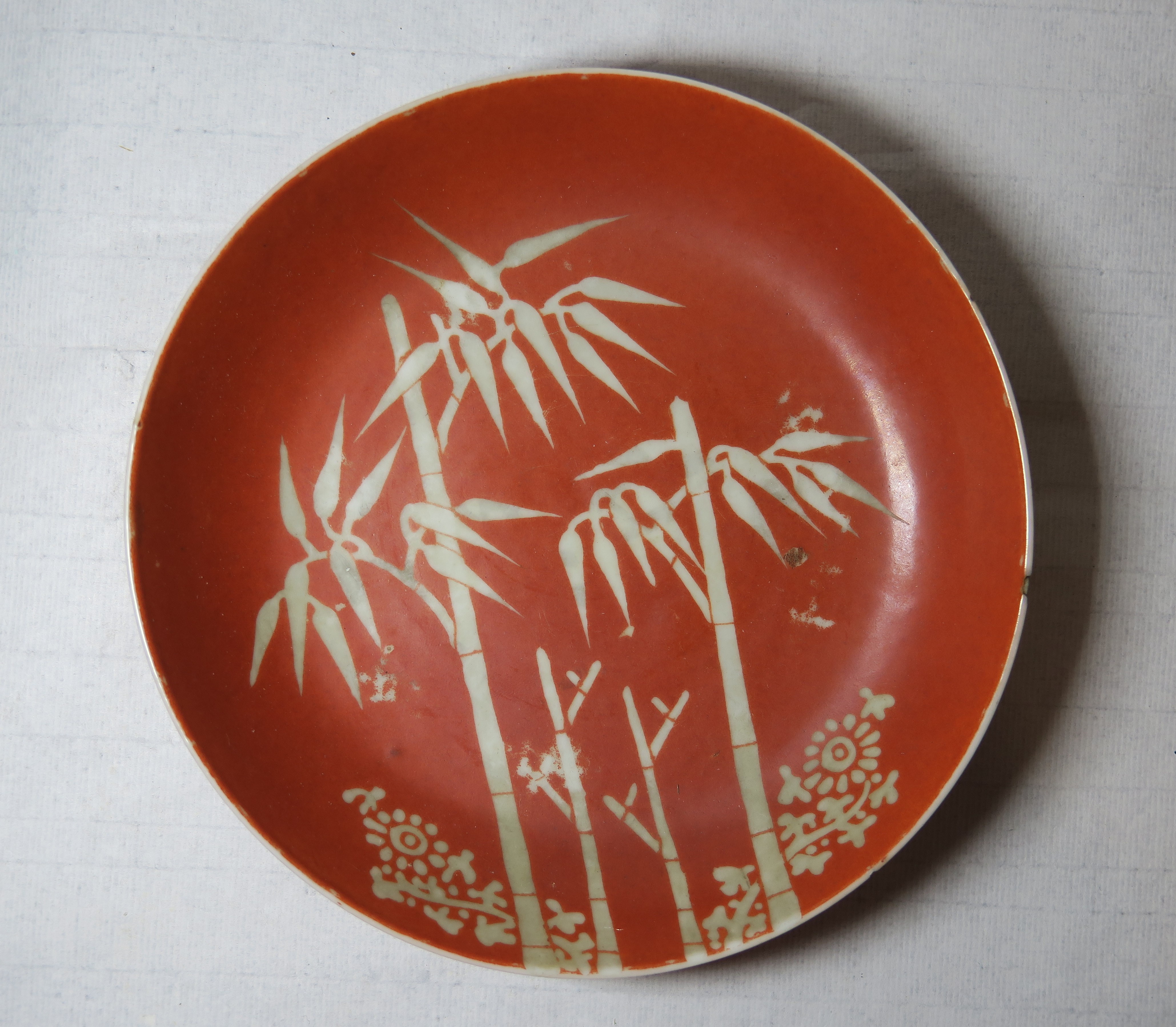 清嘉庆款矾红釉描金竹纹碟