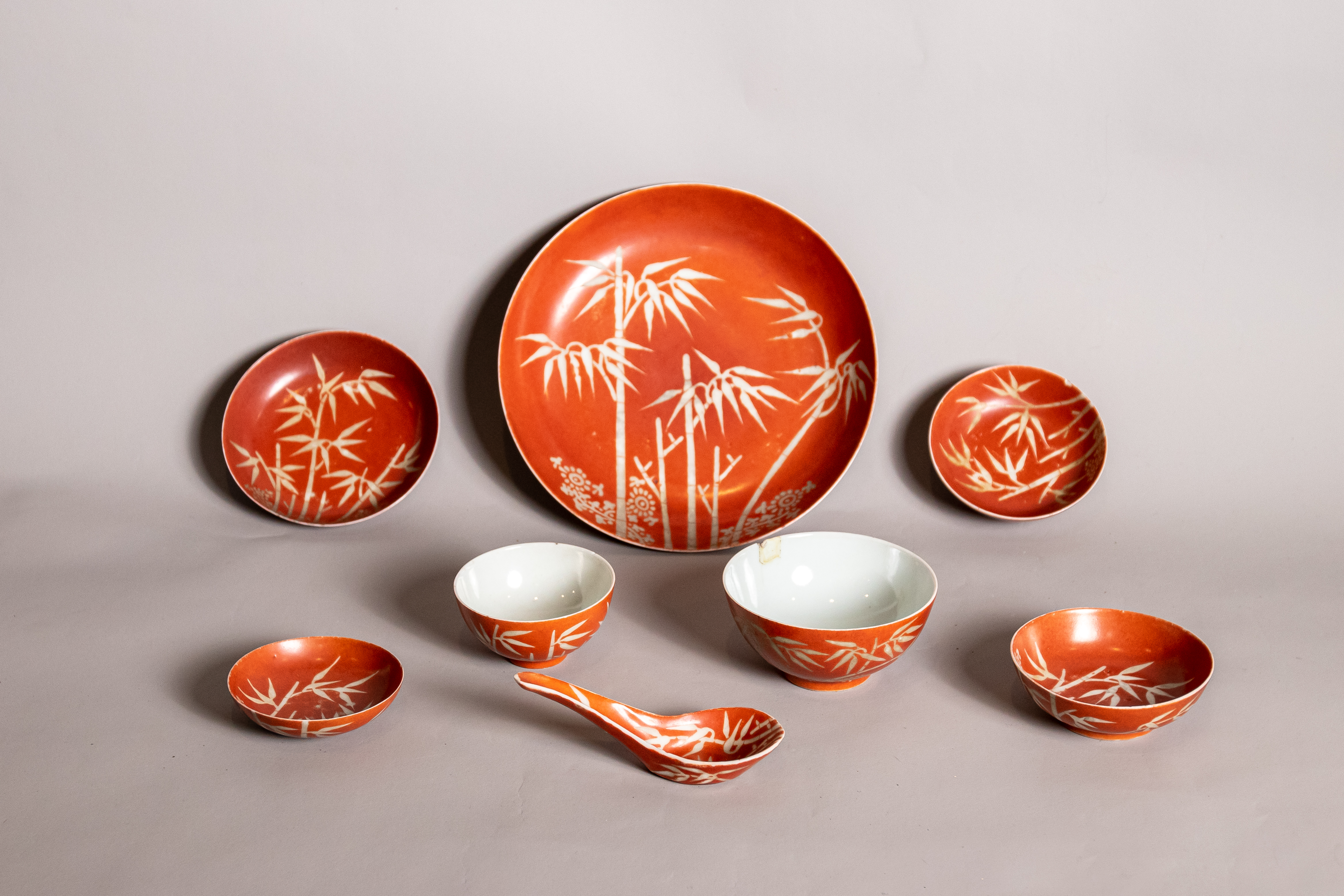 清嘉庆款矾红釉描金竹纹餐具