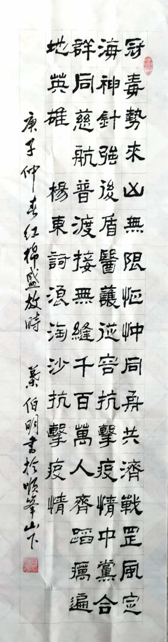 2020年叶伯明隶书七言诗《同舟共济战罡风》条幅