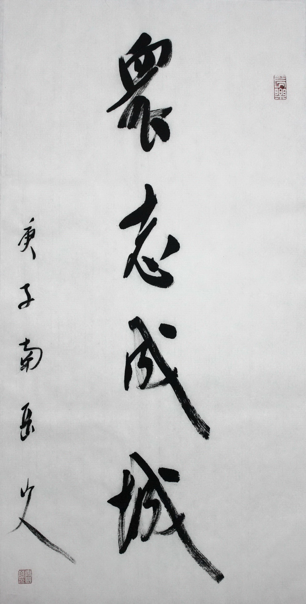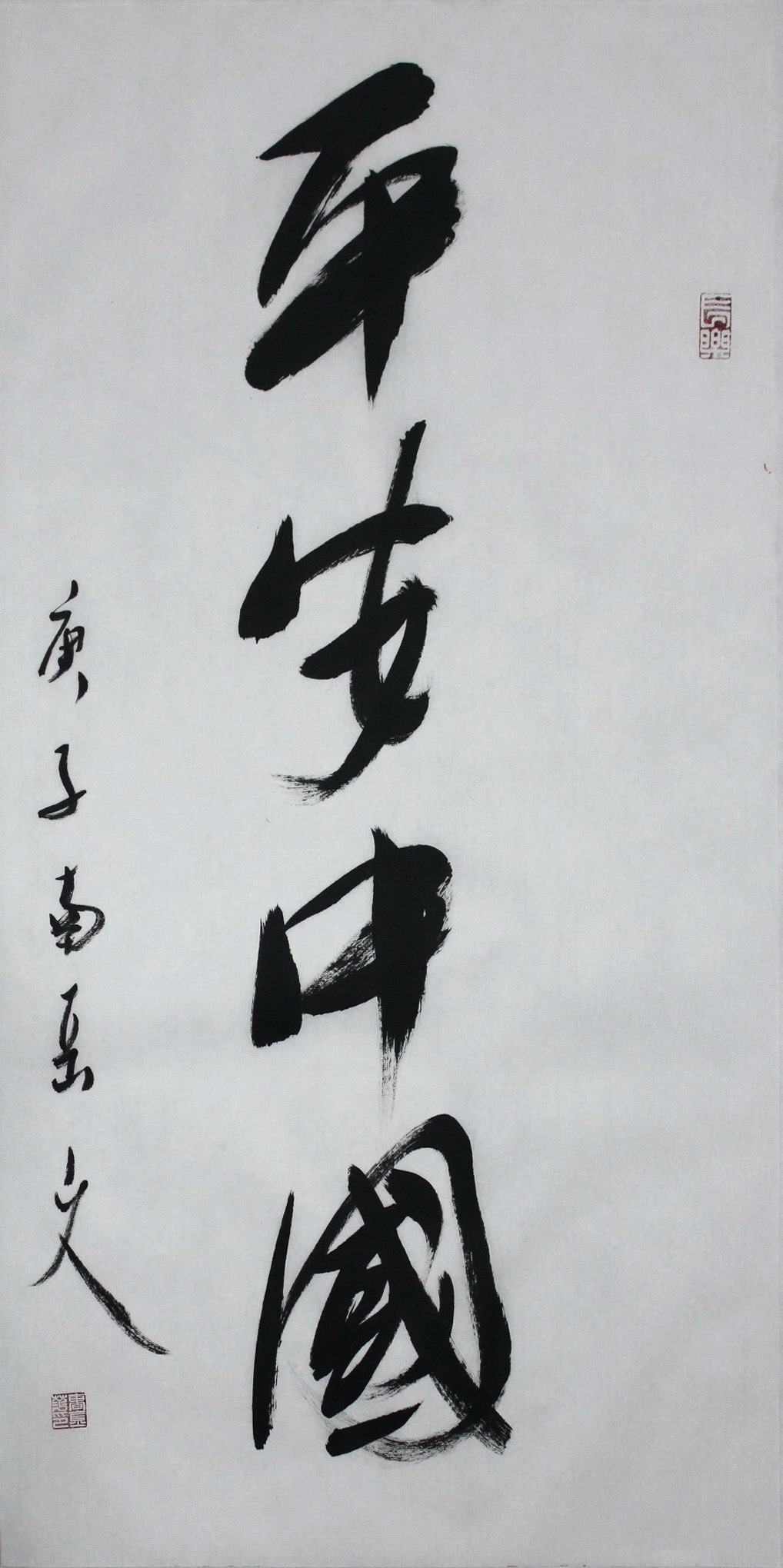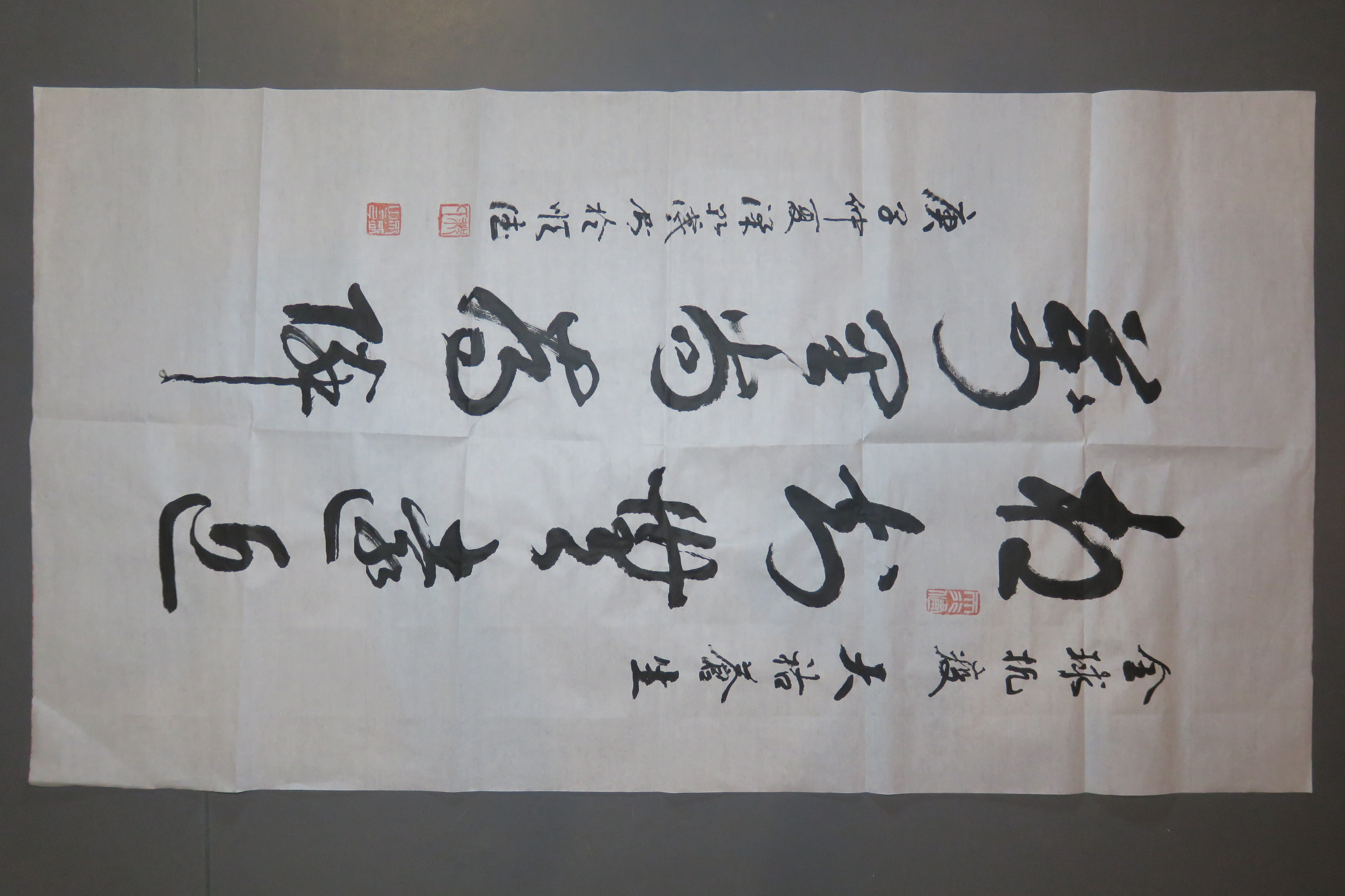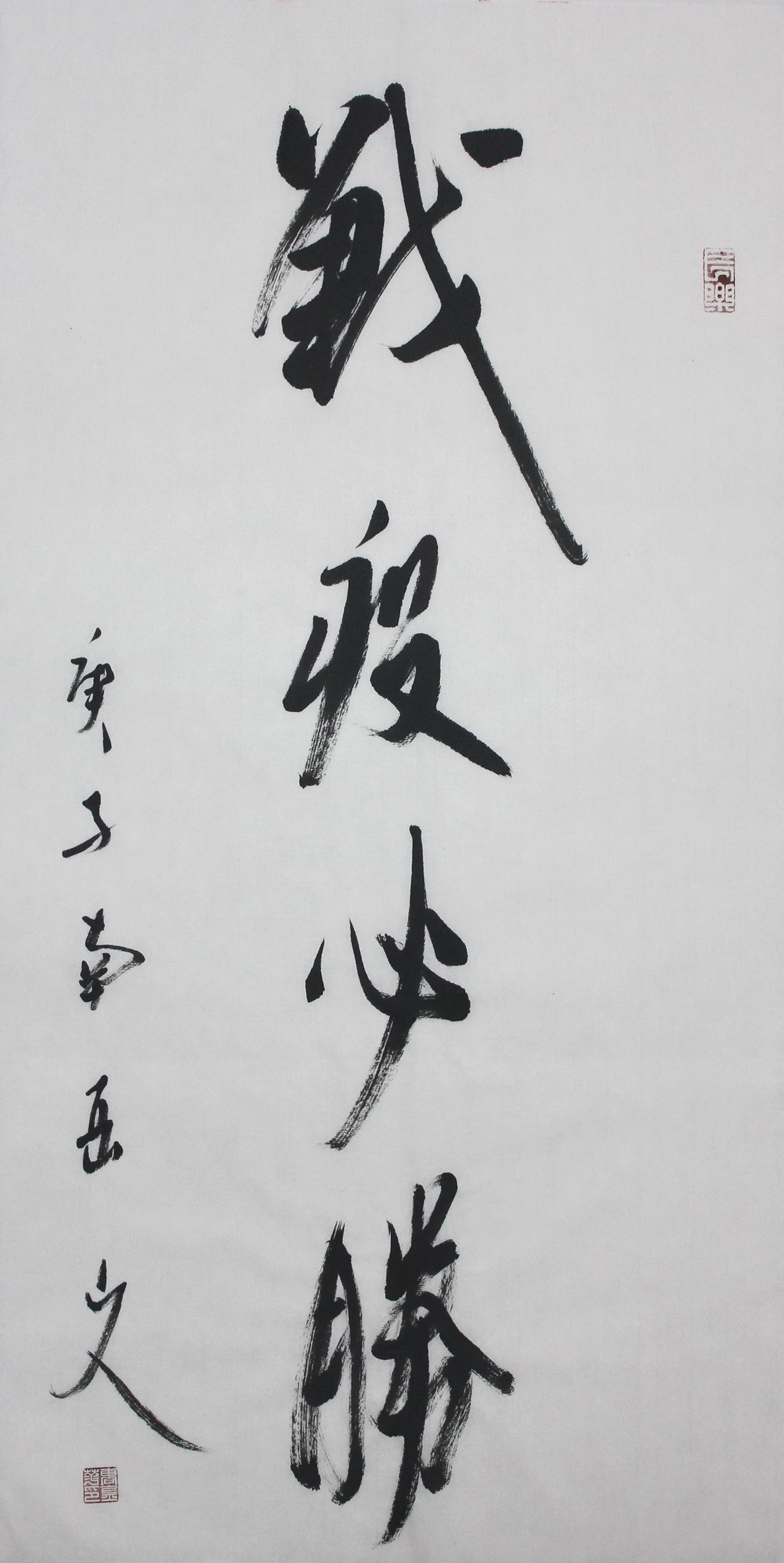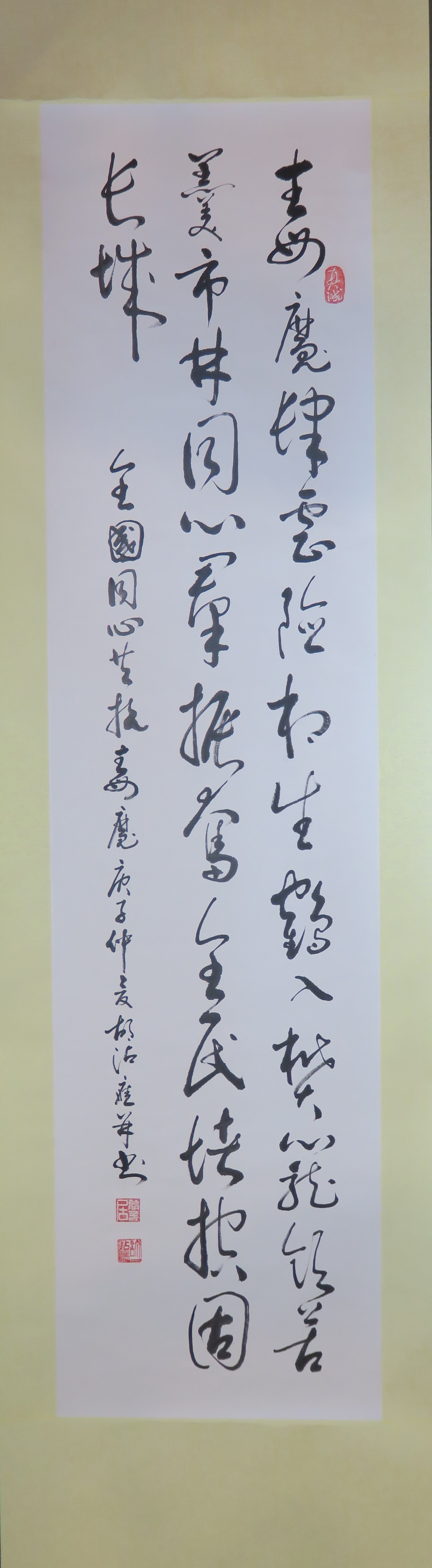 2020年梁孔盛草书五言联《全民抗疫天佑苍生》条幅