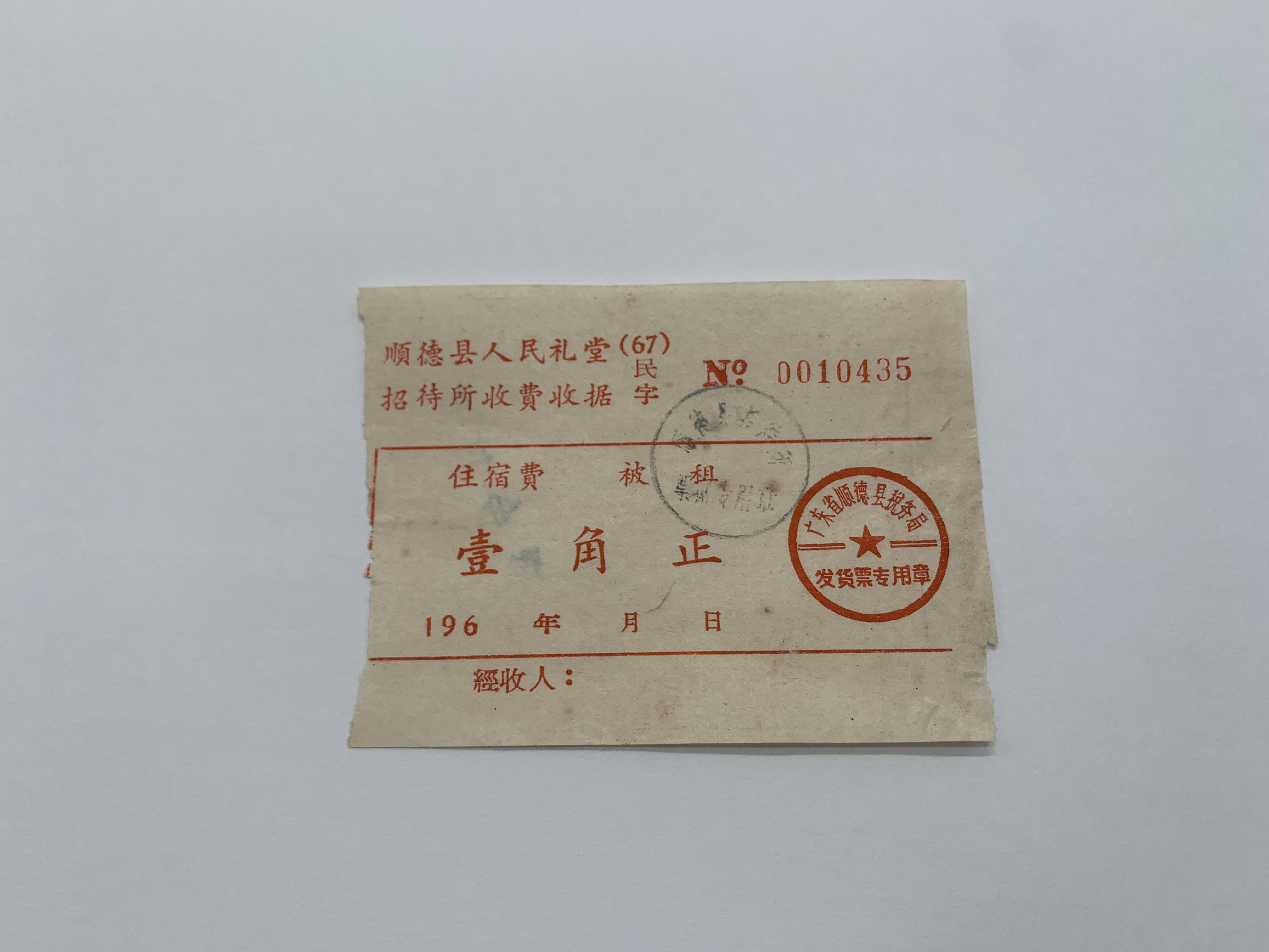 二十世纪六十年代顺德县人民礼堂招待所收费收据