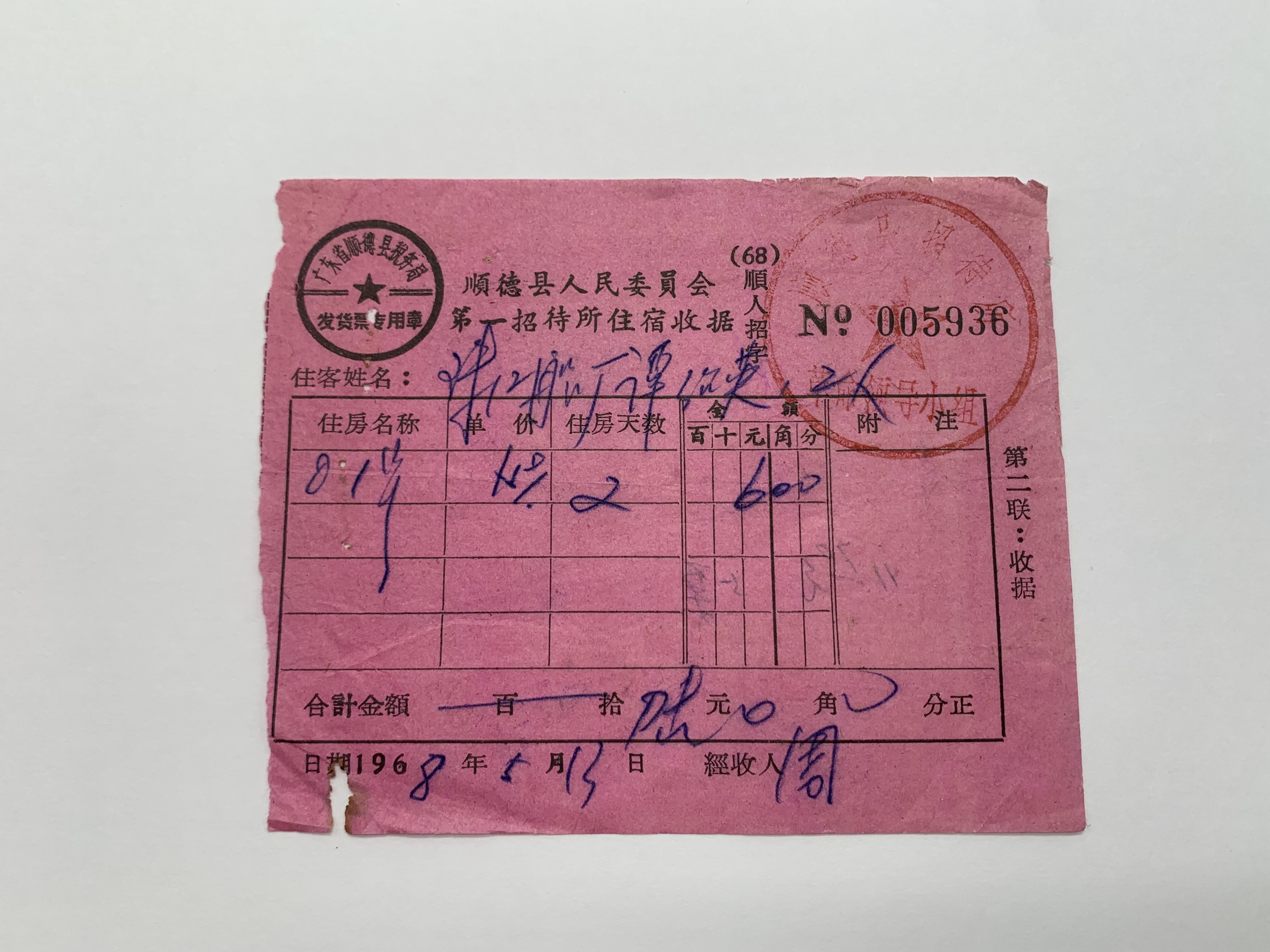 1968年顺德县人民委员会第一招待所住宿收据