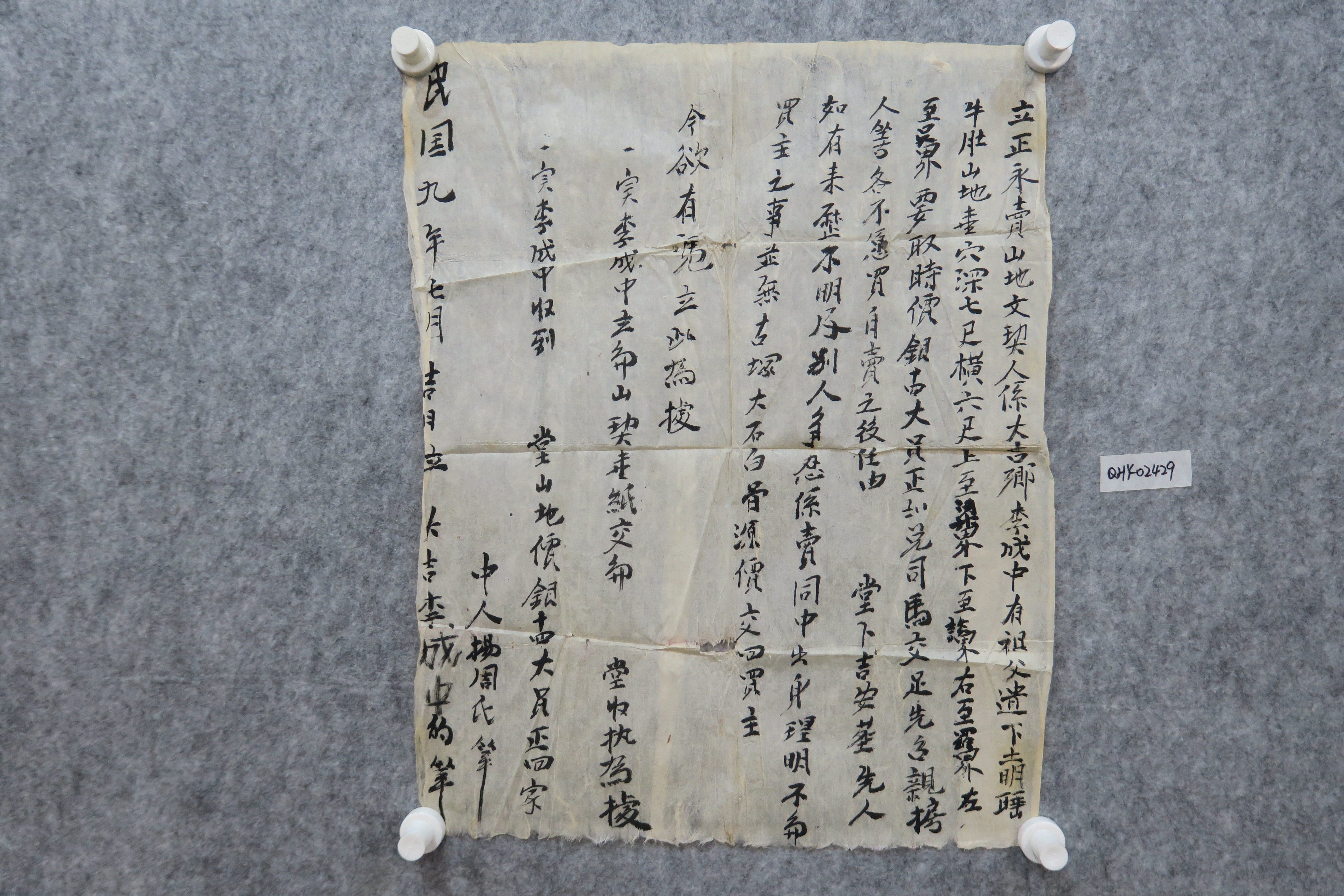 中华民国九年永卖睡牛肚山地契纸