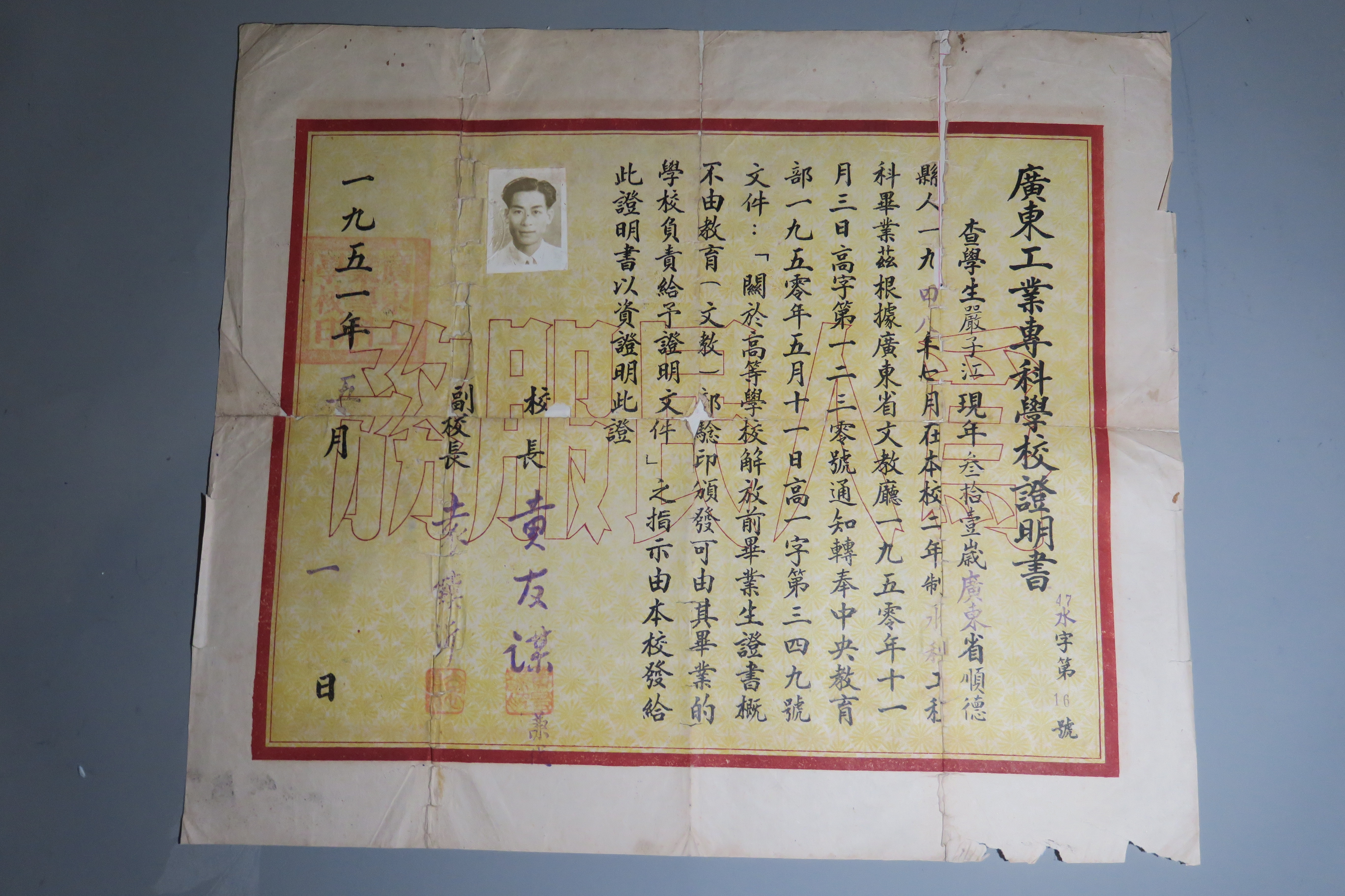 1951年顺德县人严子江在广东工业专科学校毕业的证明书