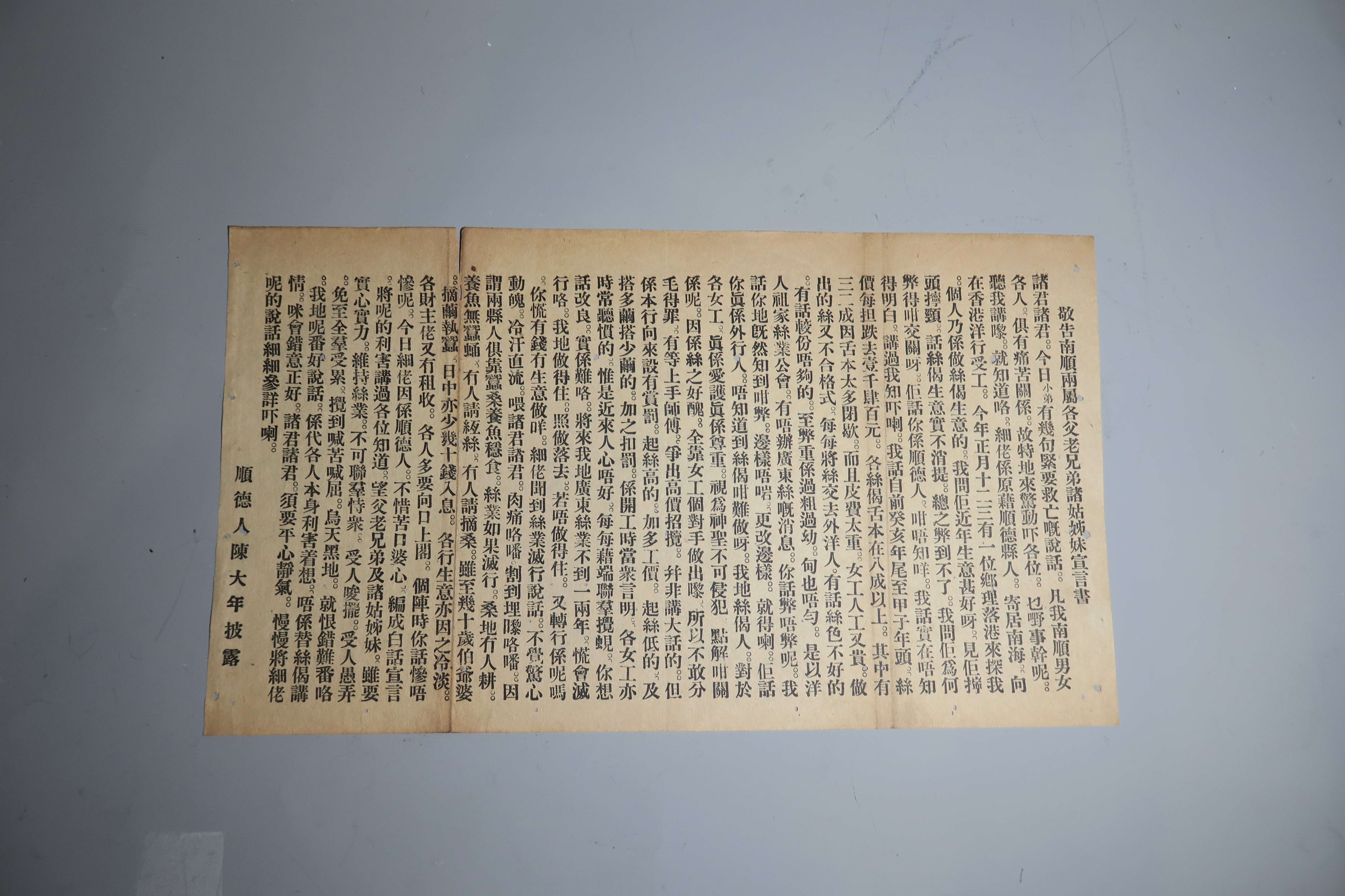 1924年顺德人陈大年敬告南顺两属各父老兄弟诸姑娣妹宣言书