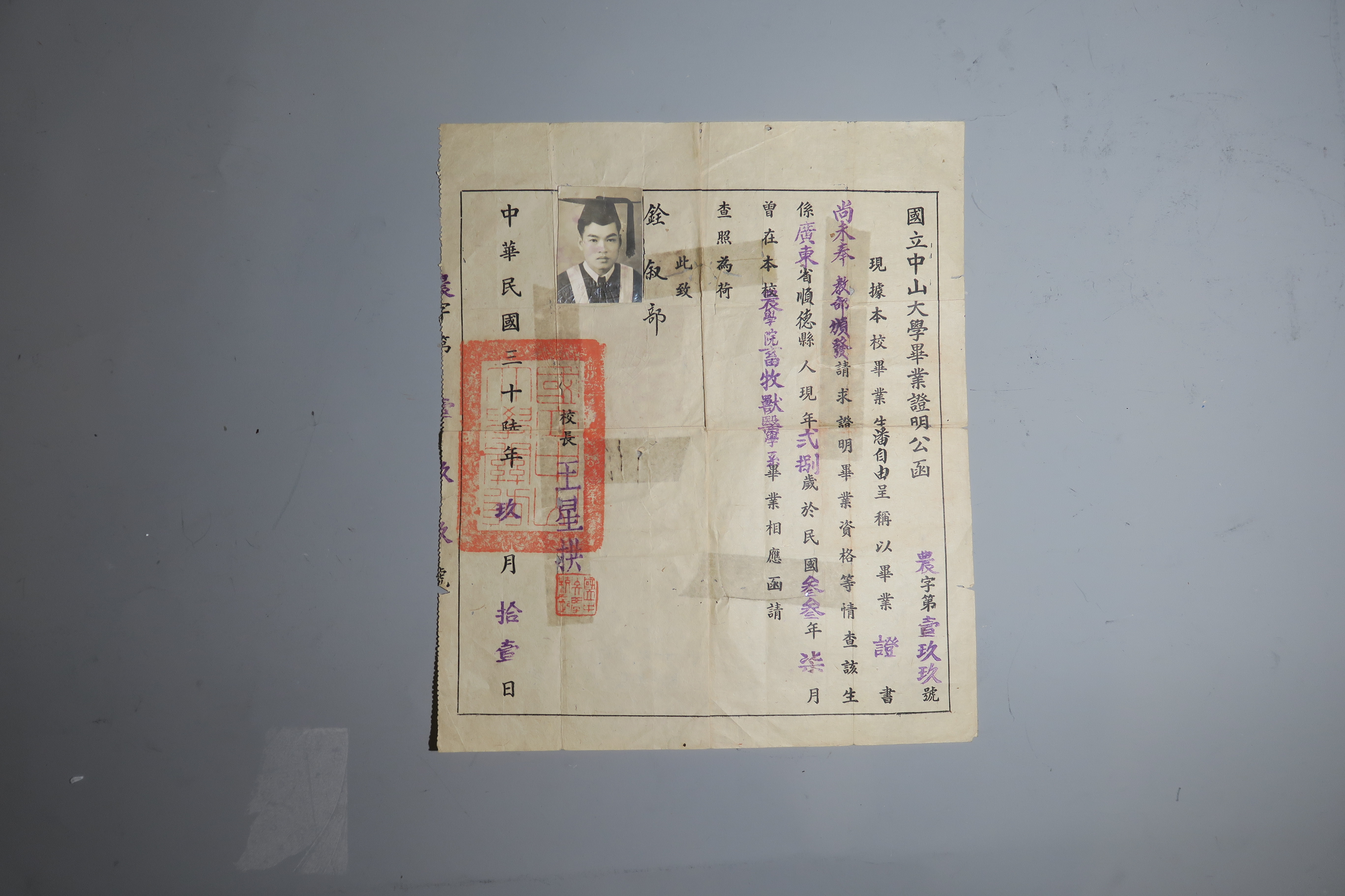 1947年广东省顺德县人在国立中山大学毕业证明公函