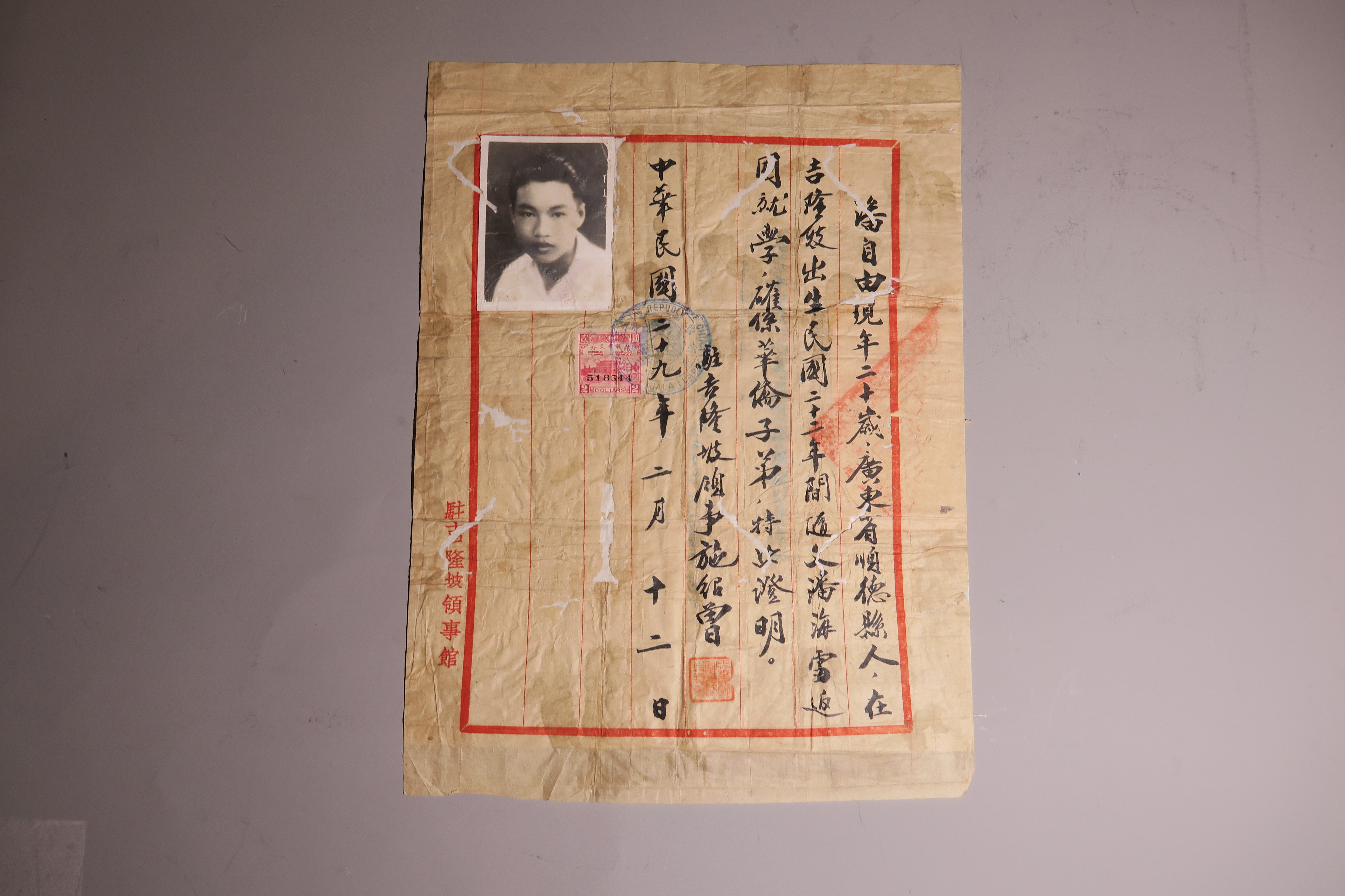 1940年广东省顺德县人华侨子弟入学证明书