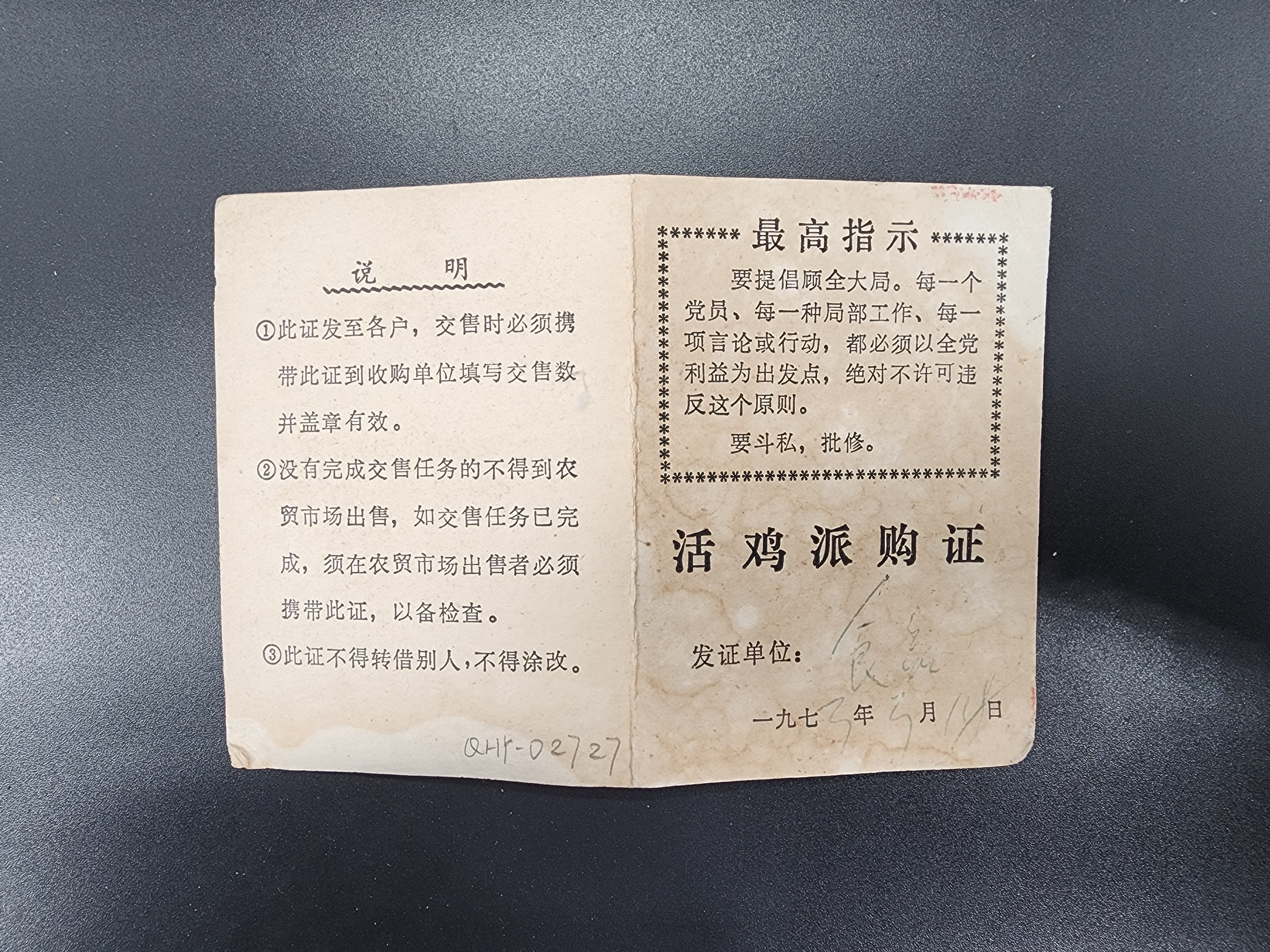 1973年活鸡派购证