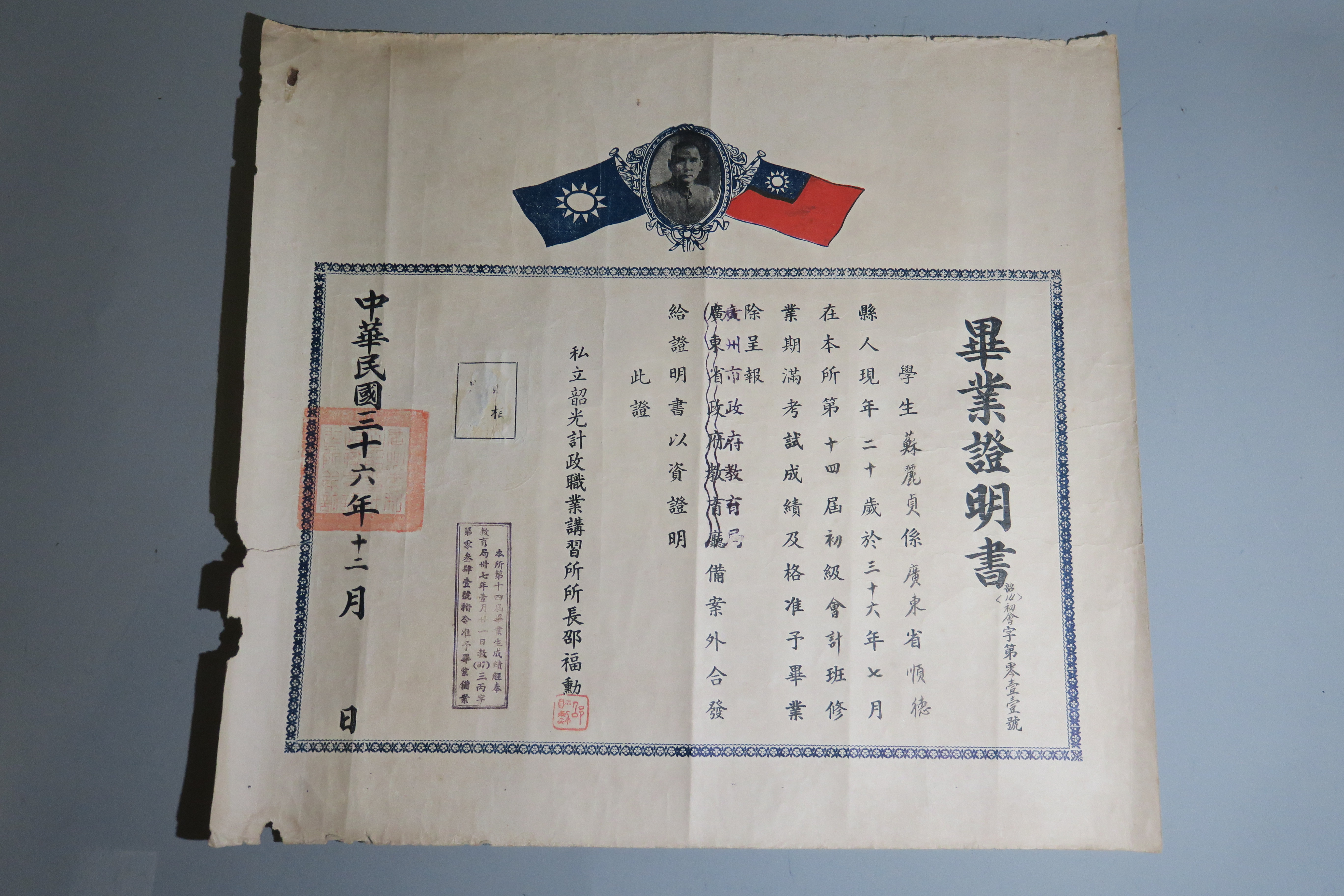 1947年广东省顺德县人修满初级会计的毕业证明书