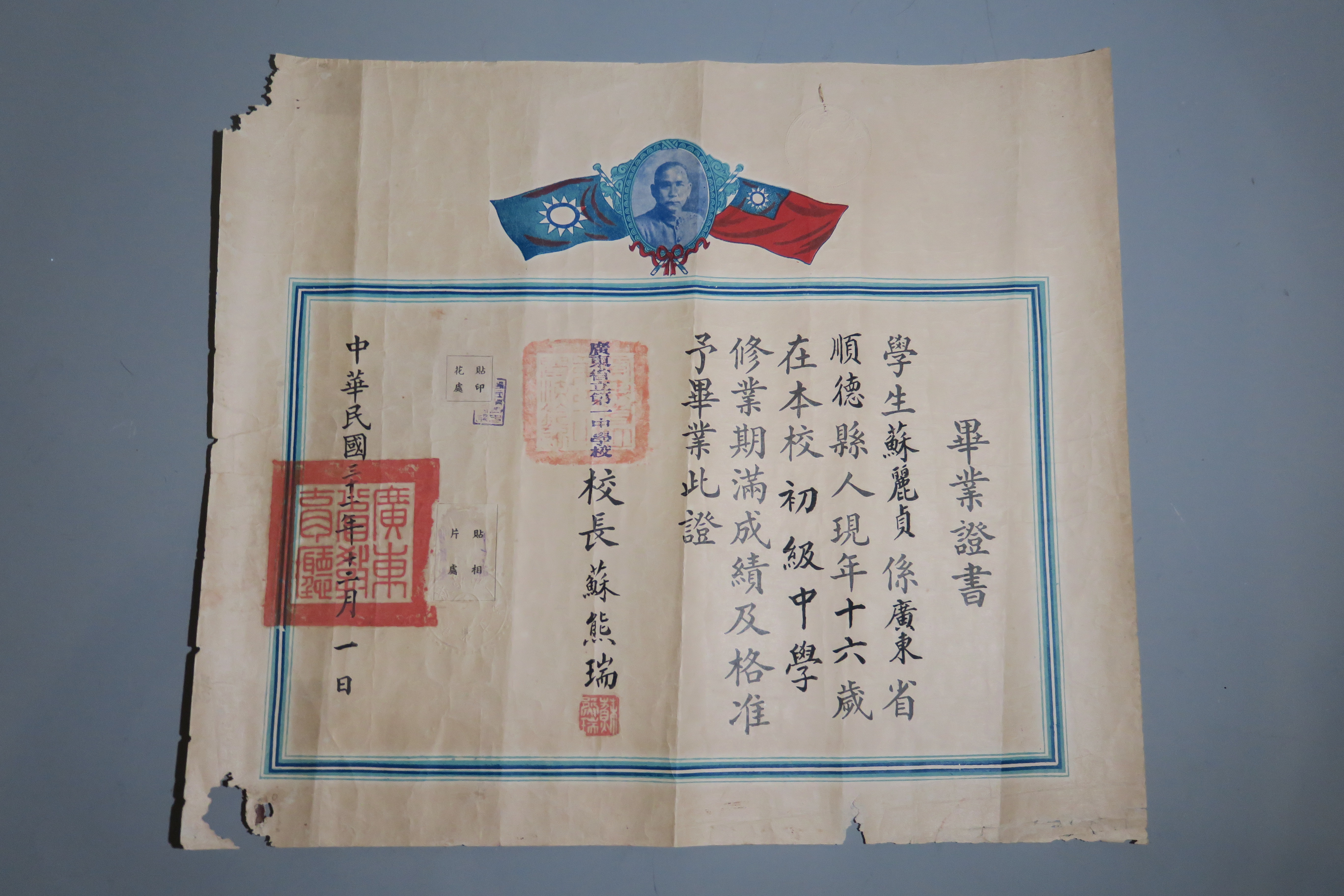 1943年广东省顺德县人苏丽贞在广东省立第一中学校的毕业证书