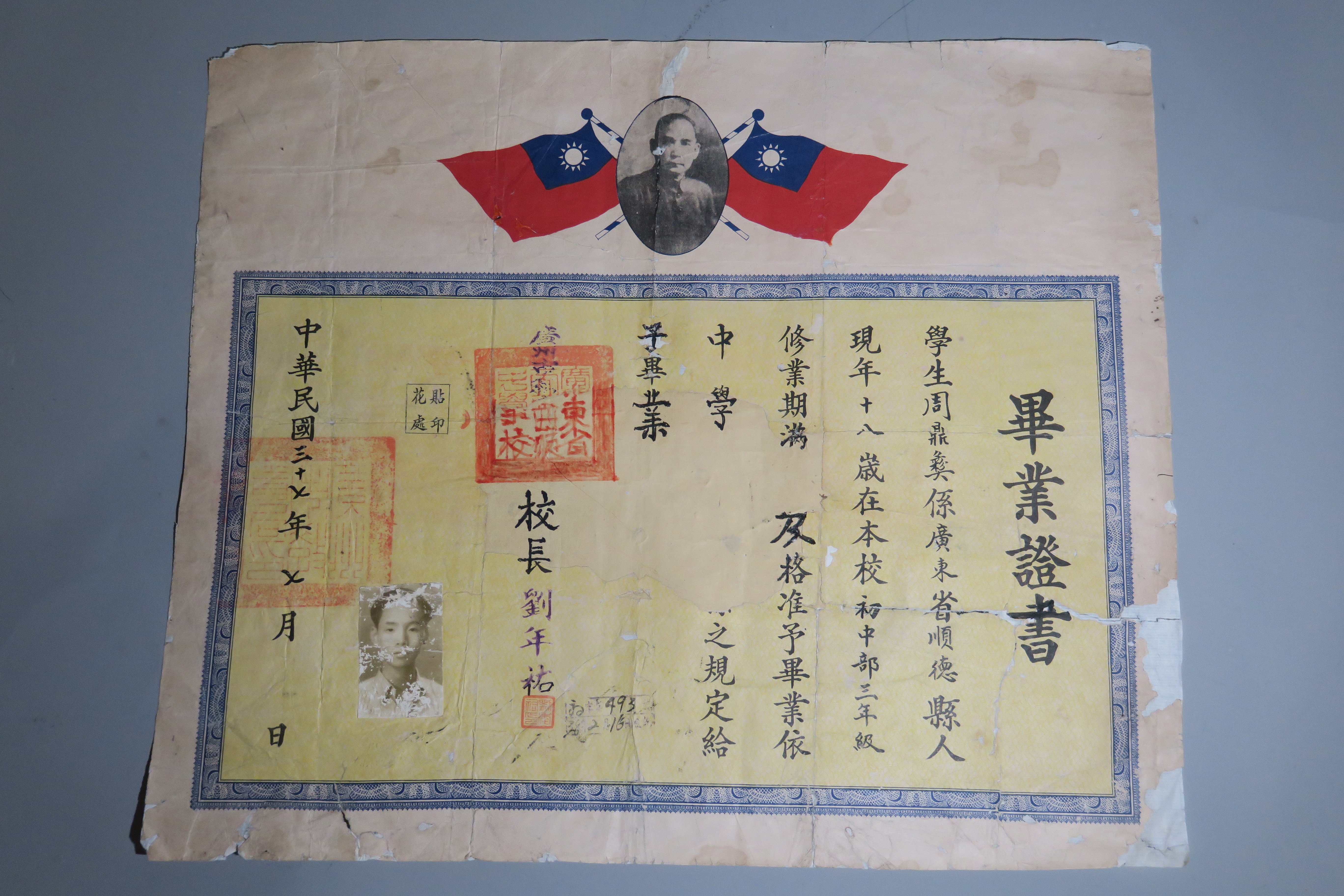 1948年广东省顺德县人在广州市中学校的毕业证书